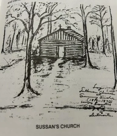 In 1820, George Reinhart deeded land to the German Lutheran and Dutch Reformed congregations, leading to the construction of Sussan’s Church. Located in an oak grove near the old state road, it became the first dedicated church building in the region, named in honor of Susannah Wiles, Reinhart’s wife.